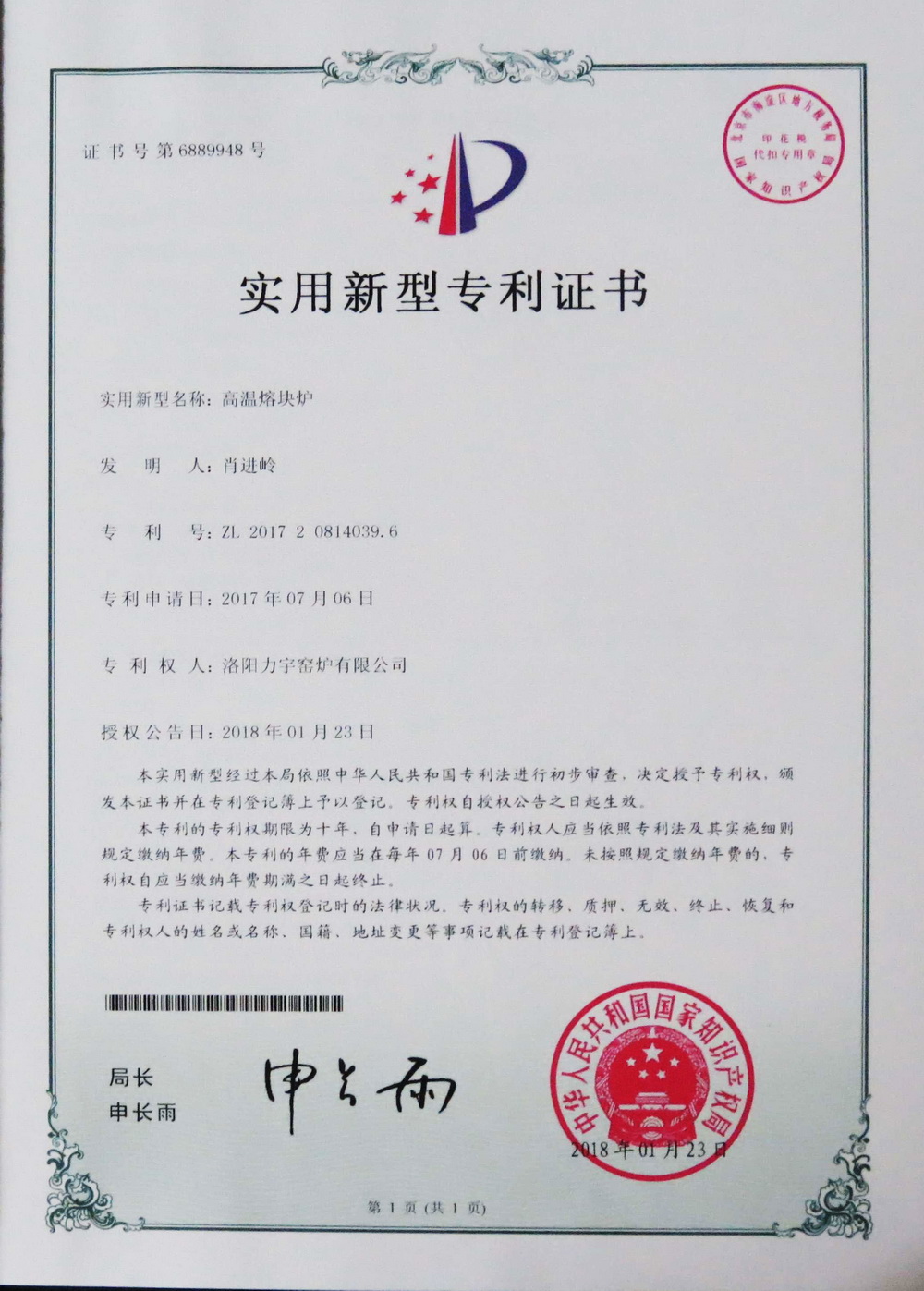 安全型高溫熔塊爐實用新型專 利證書